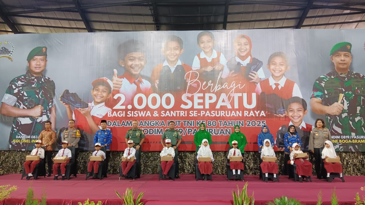 PASURUAN, KLIKNEWS.co.id – Sebanyak 2.000 pelajar dan santri di wilayah Pasuruan Raya menerima bantuan sepatu baru melalui kegiatan bakti sosial yang diselenggarakan Kodim 0819/Pasuruan bersama Korem 083/Baladika Jaya, Senin (17/11/2025). Kegiatan ini dipusatkan di GOR Kota Pasuruan sebagai bagian dari rangkaian peringatan HUT ke-80 Tentara Nasional Indonesia (TNI).