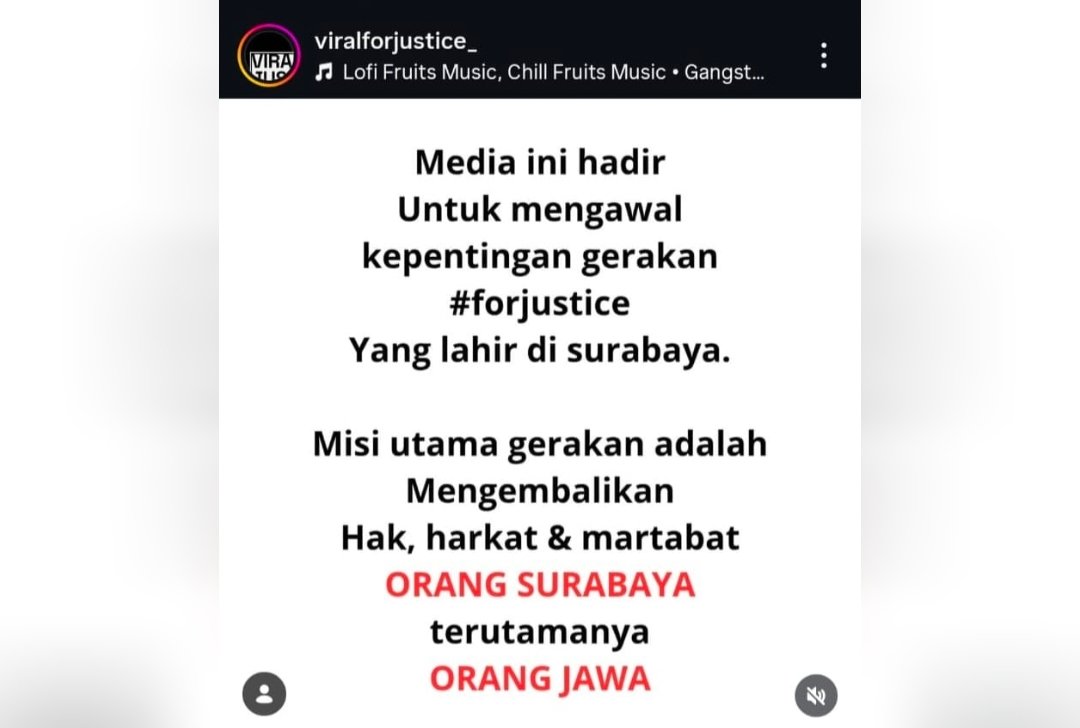 SURABAYA, KLIKNEWS.co.id – Beredarnya video dari akun Instagram @viralforjustice memunculkan tanda tanya besar mengenai motif di balik narasi yang disampaikan. Konten tersebut dinilai bukan sekedar opini emosional, tetapi berpotensi menjadi propaganda identitas yang dapat memicu segregasi sosial di Surabaya.