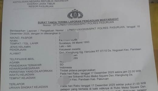 Berdasarkan surat pengaduan nomor LPM/511/II/2025/SPKT Polres Pasuruan tertanggal 18 Desember 2025, laporan dugaan tindak pidana pengerusakan telah resmi diterima pihak kepolisian.